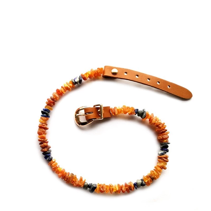 I collari sono realizzati in ambra naturale GREZZA e sono dotati di comodo CINTURINO REGOLABILE IN CUOIO..