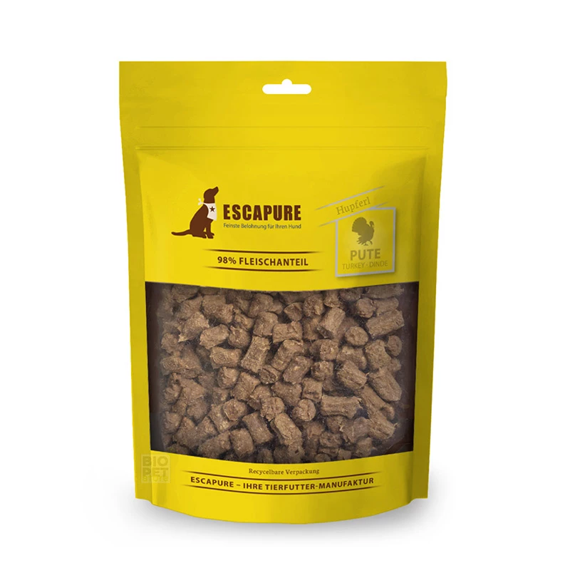 97,0% Carne di Tacchino essiccata all’aria, 1,5% di fibra grezza di mela, 0,5% di sale marino.