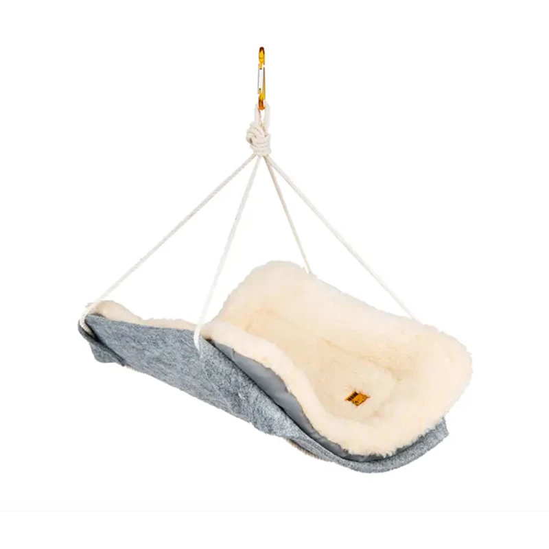 L’amaca è dotata di un rivestimento interno rimovibile e lavabile in lavatrice, realizzato in lana d’agnello artificiale.