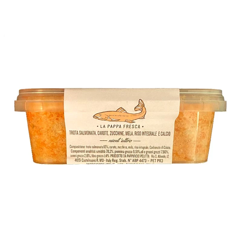 COMPOSIZIONE : Trota salmonata 65%, carota, zucchina, mela, riso integrale, carbonato di calcio.