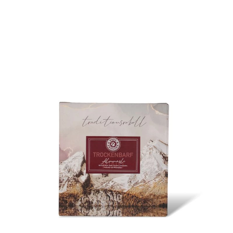 Il MUESLI ALPINO di Paul & Paulina è composto per il 75% da carne delicatamente essiccata all’aria e per il 25% da miglio, frutta, verdura ed erbe aromatiche.