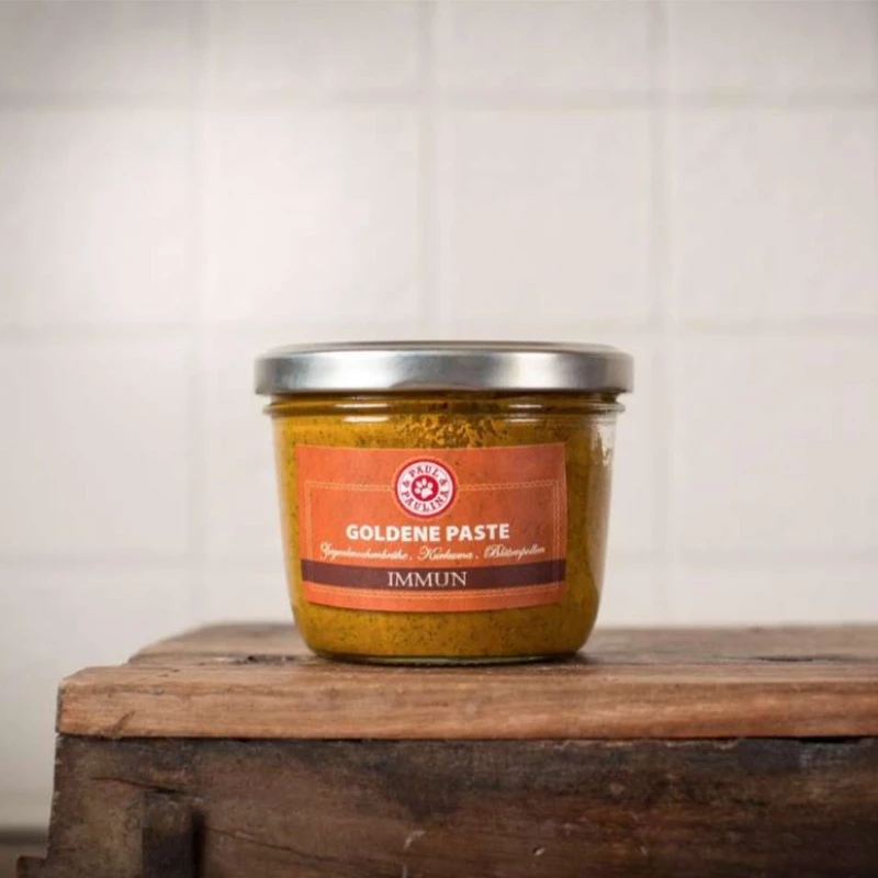 Curcuma, olio di cocco, polline d’api, brodo di ossa di capra, pepe, farina di canapa.