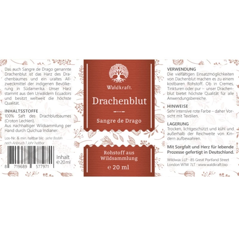 Il prodotto di alta qualità di Waldkraft contiene linfa pura al 100% dell’albero del sangue di drago, che cresce ad un’altitudine di oltre 1000 metri nella biodiversità naturale, lontano dall’agricoltura industriale, dall’elevato inquinamento dell’aria o dalla contaminazione del suolo.