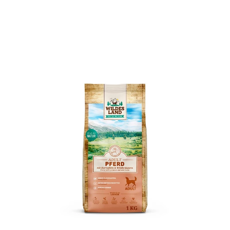 Carne equina fresca 20%, patate 18%, carne equina essiccata 14%, piselli 10%, grasso di pollo, fagioli 6%, proteine ??di patate, semi di lino 3%, lievito di birra, polpa di barbabietola, alghe 0,3%, cloruro di sodio, frutto-oligosaccaridi (FOS 0,2%), estratto di lievito (MOS 0,2%), estratto di yucca 0,03%, cardo mariano 0,02%, dente di leone 0,02%, rosmarino 0,02%, ibisco 0,02%, rosa canina 0,002%.